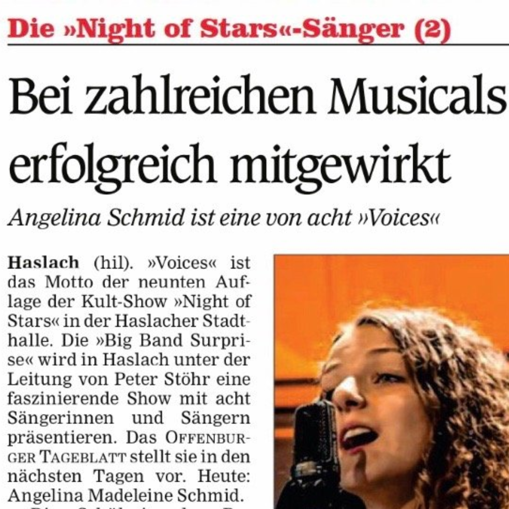 "Eine Überraschung, sowohl in musikalischer, als auch in optischer Hinsicht, war der Auftritt der jungen Sängerin Angelina Madeleine, einer Preisträgerin in „Jugend musiziert“ und Hauptrollen-Sängerin im Musical „West Side Story“. Was diese Sängerin musikalisch und nicht zuletzt mit ihrem theatralischen Auftreten bot, war allererste Sahne, zumal sie mit ihrer Stimmgewalt die Bigband glatt auf den zweiten Platz zu verweisen schien. (...)"